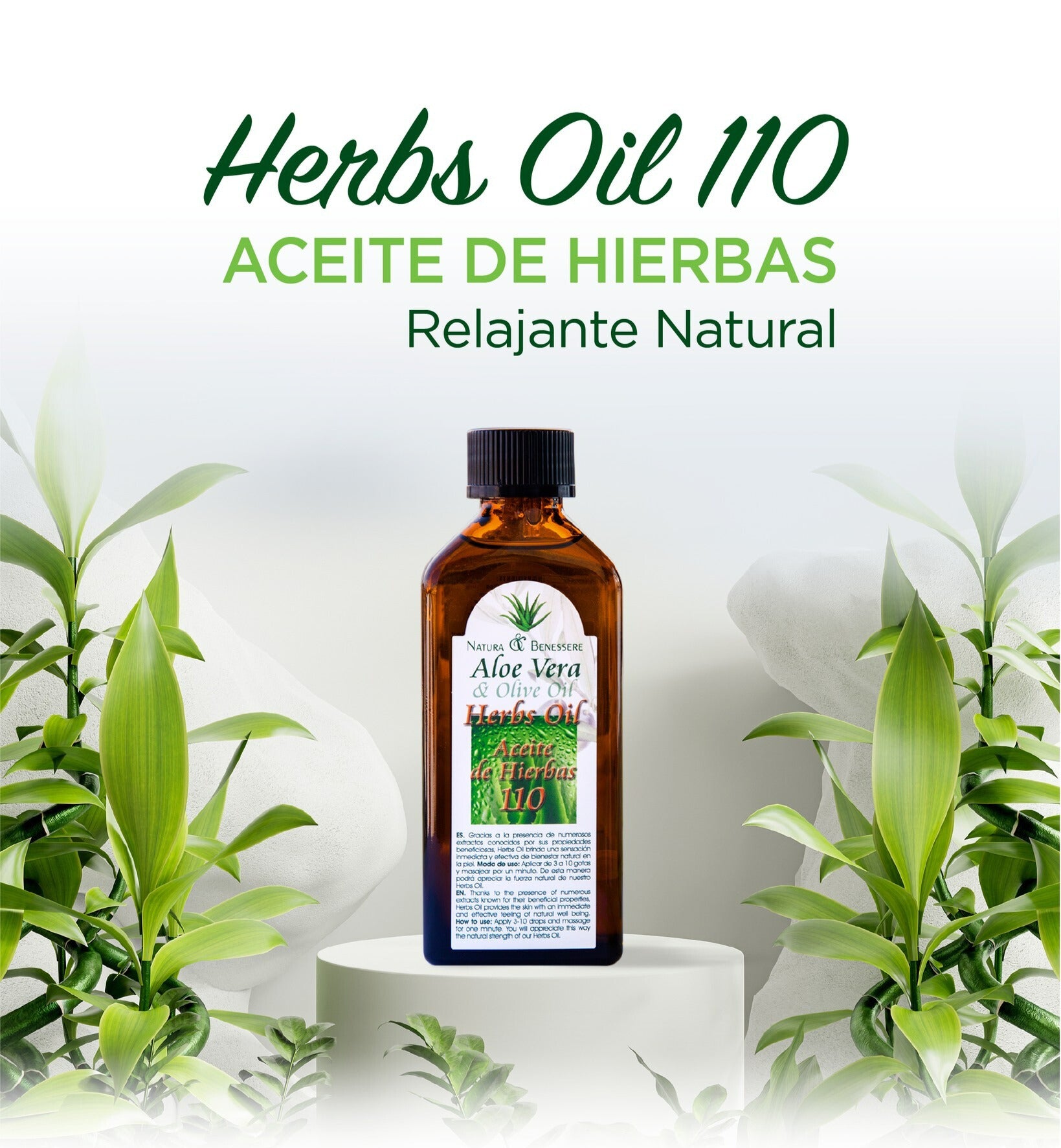 Natura Benessere Aloe Vera olive oil Herbs oil Krauter Ol 110 es una combinación de aceites esenciales concentrados que se puede emplear en diversas situaciones. Se trata de un remedio natural sumamente beneficioso en situaciones de molestias musculares o articulares, gracias a la mezcla de sus aceites esenciales que proporciona un efecto calmante y relajante. Este aceite de 110 hierbas está diseñado específicamente como aceite para masajes corporales, brindando cuidado integral desde la cabeza hasta los pies